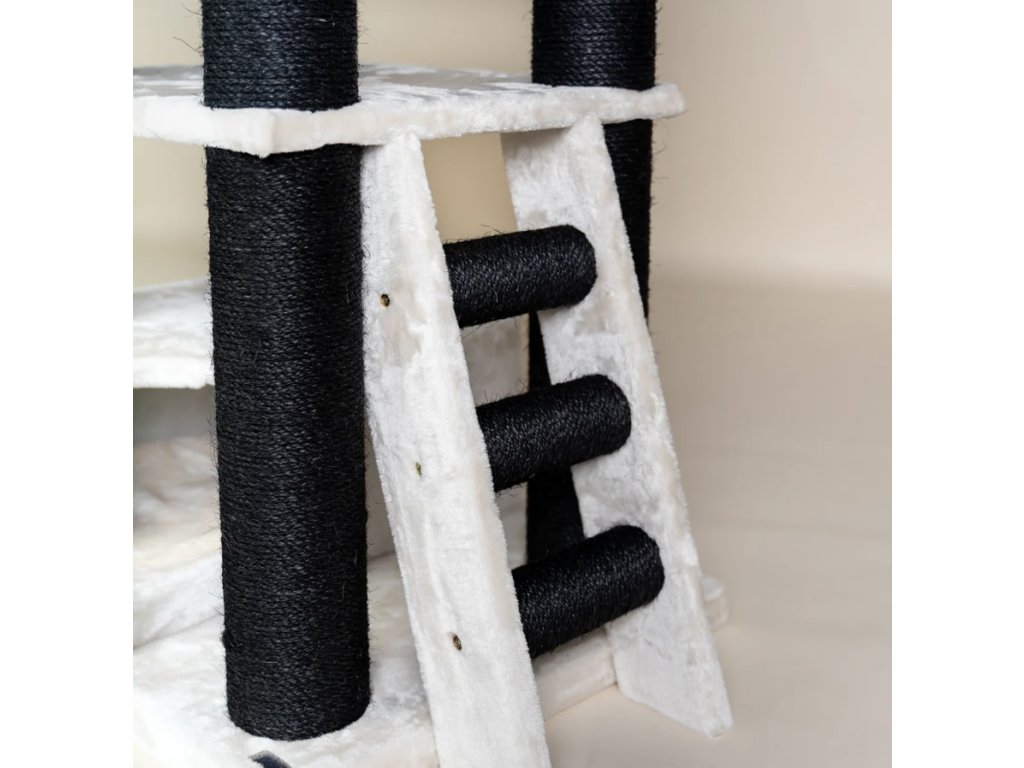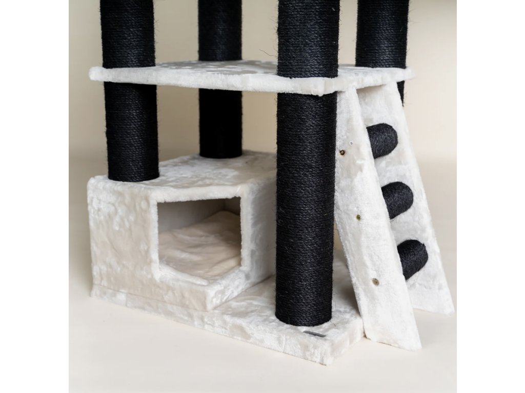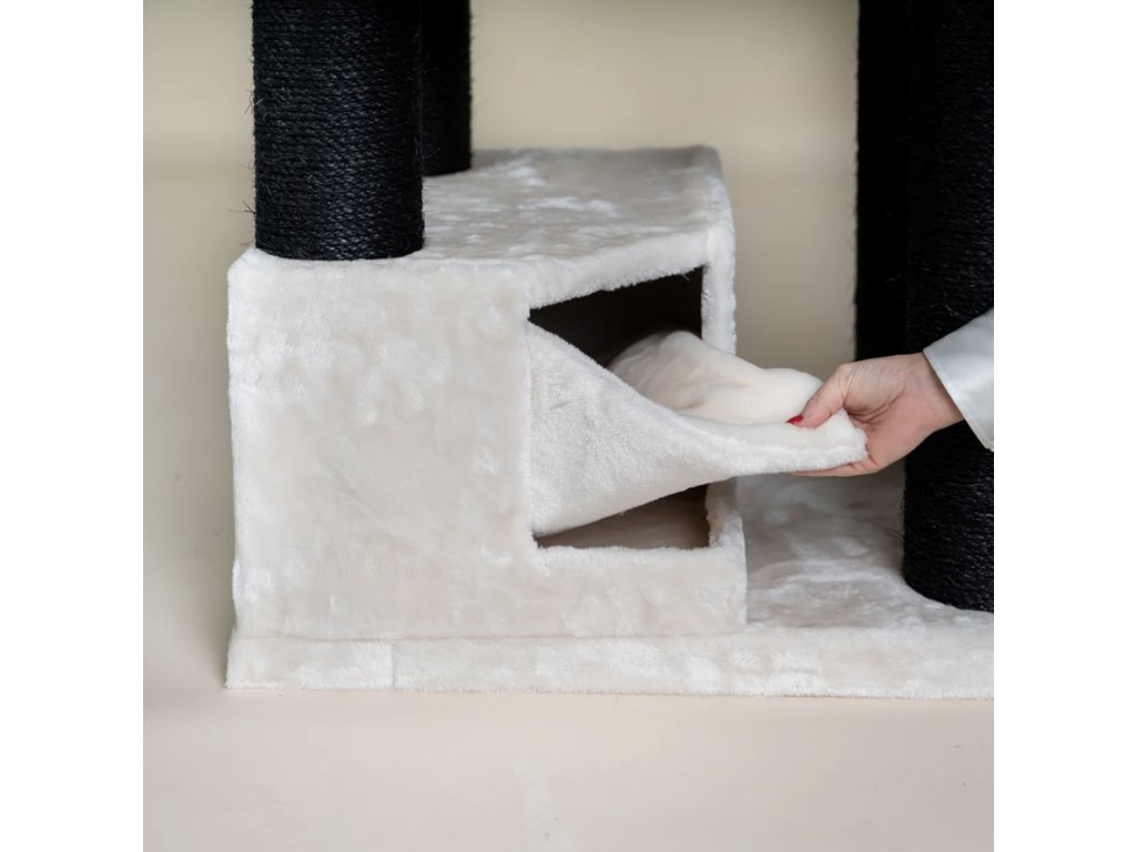 - Spodní podlaha, která je základem celé struktury škrabadla o rozměrech 65 cm x 55 cm šířka x 4 cm tlustá s domem pokrytým měkkým plyšem 55,5 cm x 30 cm široká x 25 cm vysoká, poskytne vaší kočce vše, o čem sní, zatímco odpočívá.