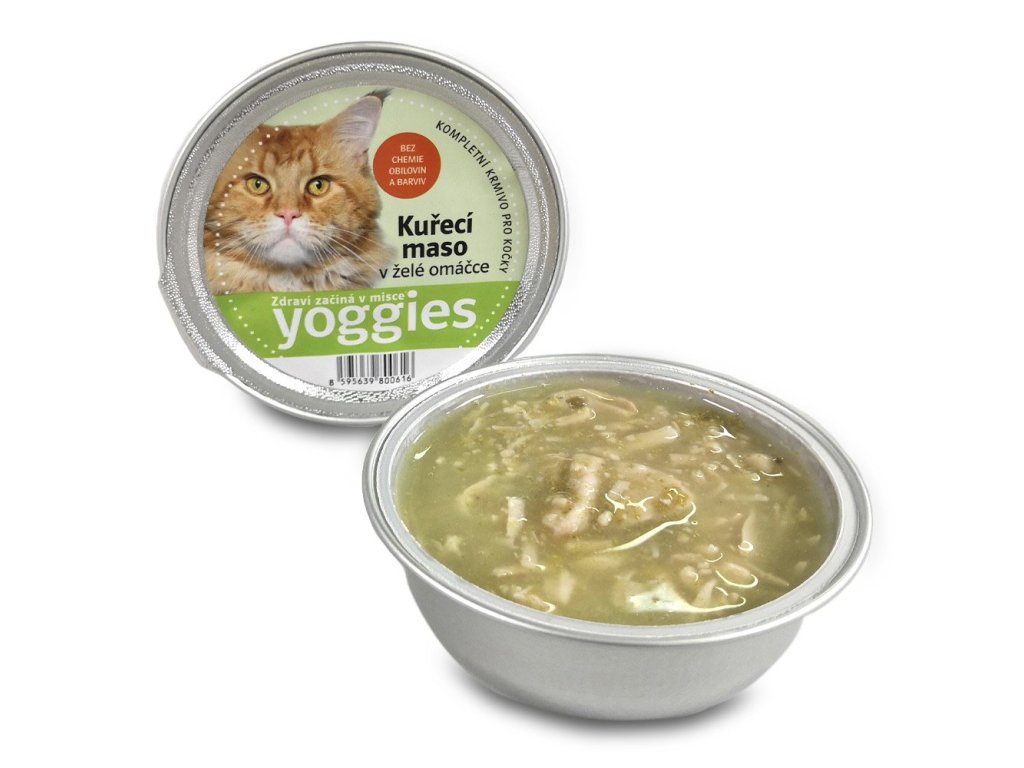 Yoggies mističky pro kočky se šťavnatým kuřecím masem a především lahodnou želé omáčkou se jistě stanou pochoutkou pro všechny dospělé kočky. Maso pochází z kvalitních Německých a Holandských chovů a želé omáčka je vyráběna z vývaru z těchto mas, kostí a kvalitní zeleniny. Tyto mističky a jejich obsah mohou být kompletním krmivem pro kočky, protože mají obsah nezbytných důležitých živin vč.např.aminokyseliny Taurin.