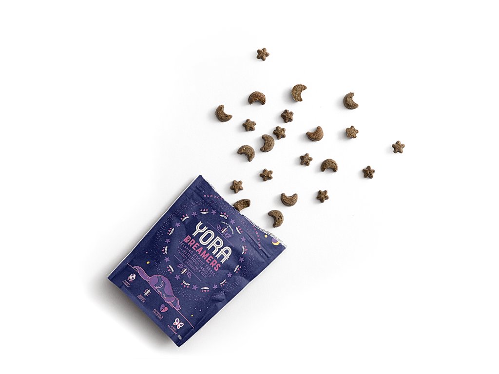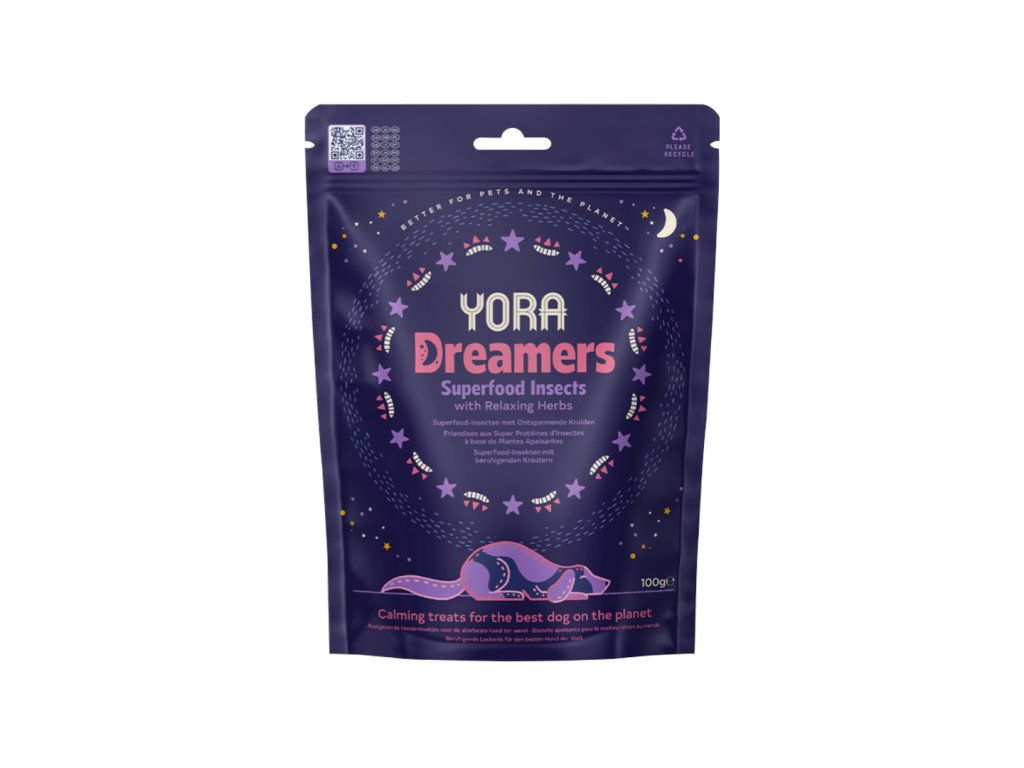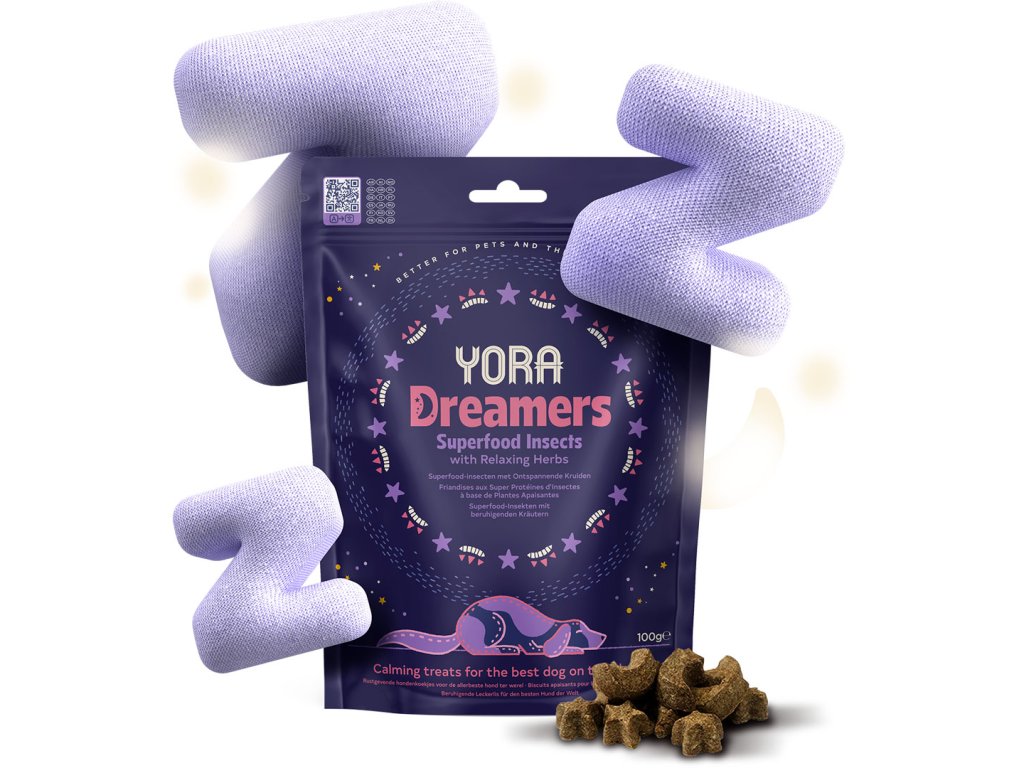 Pamlsky Yora Dreamers z hmyzího proteinu jsou jedinečné z mnoha důvodů. Hmyzí moučka jemně zapečená s ovsem, cizrnovou moukou doplněná mučenkou, rmencem, kořenem kozlíku lékařského a meduňkou tvoří pamlsky, které zklidňují úzkostné psy. Složení pamlsků Yora Dreamers pomáhá psům také relaxovat před spaním nebo v situacích, kdy se cítí nervózní.